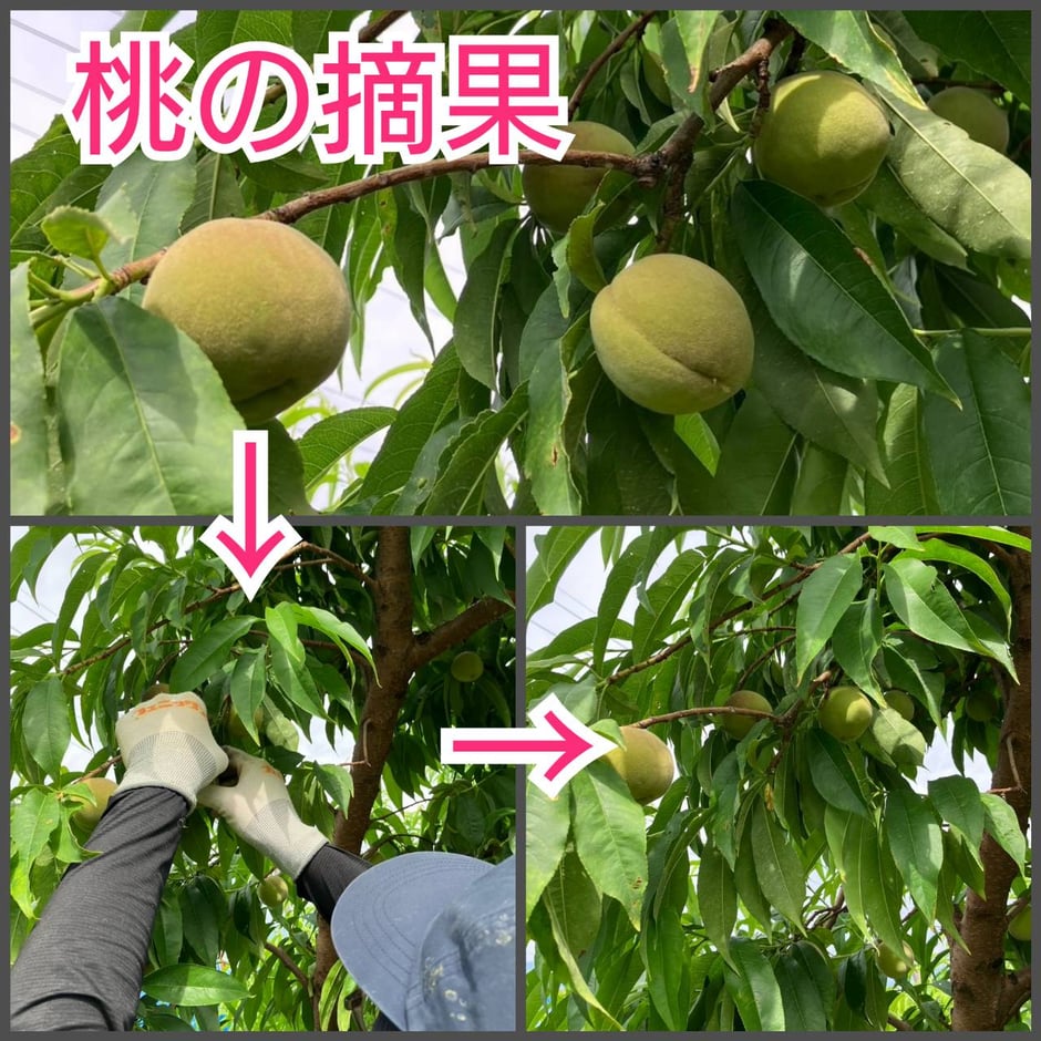 ④桃の摘果・・・こちらもりんごやプルーン同様不要な実を落とします。りんごやプルーンと違って桃はあと1ヵ月ほどで収穫を迎えるため、一刻も早くやらねばならない作業です!しかし、桃には「硬核期」といって字の如く「核(種)が硬くなる期間」というのが5月下旬から6月中旬くらいまであります。この期間に摘果作業をすると、必要以上に養分が残された実に入ってしまい、核割れといって核(種)が割れる障害が起こってしまいます。そのため硬核期が終わる6月中旬からしか摘果作業ができません💦