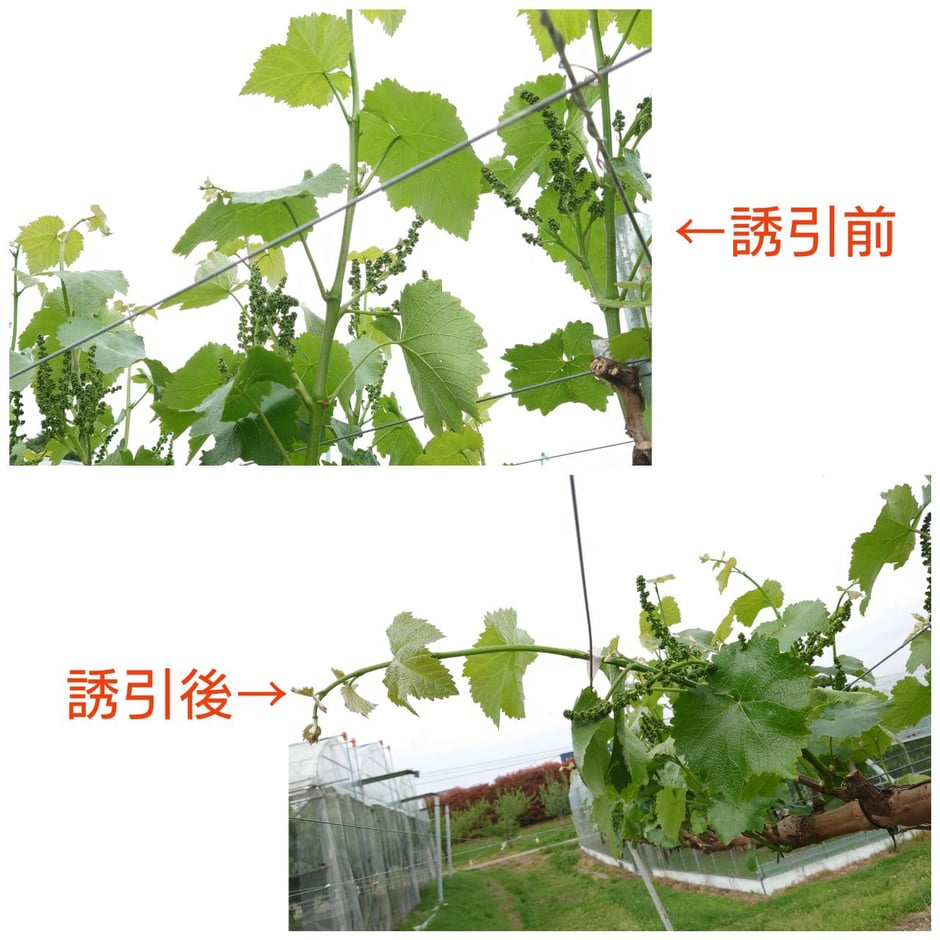 そこで、伸びた枝を整理して管理しやすくするために棚に枝を固定する「誘引作業」を行います。